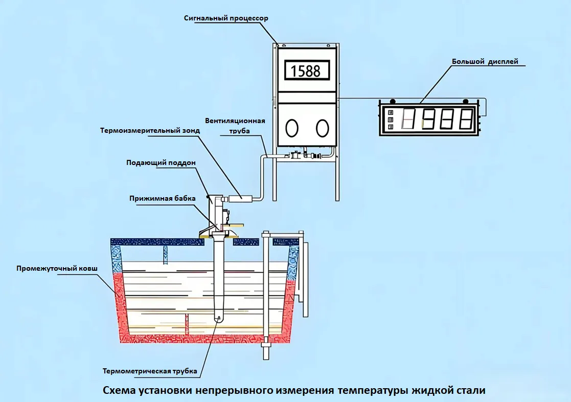 Непрерывное и точное измерение температуры расплавленной стали в промежуточном ковше является ключевым элементом систем замкнутого контура управления и контроля качества в современных процессах непрерывного литья. Этот параметр напрямую определяет внутреннюю целостность и качество поверхности отливаемой заготовки, а также эксплуатационную стабильность машины непрерывного литья заготовок (МНЛЗ), играя незаменимую вспомогательную роль в повышении эффективности производства при одновременном снижении энергопотребления и уровня брака. Опираясь на наши собственные базовые технологии, компания выпустила модель TY-C-I — термометр радиационного типа для непрерывного измерения температуры расплавленной стали. Этот продукт защищен национальным патентом (№ патента: ZL200720011415.4). Разработанное специально для условий непрерывного литья, данное устройство отличается уникальной для отрасли запатентованной конструкцией измерительной трубки, которая позволяет напрямую улавливать истинные сигналы теплового излучения, исходящие со дна ванны расплавленной стали. Этот инновационный подход позволяет кардинально устранить недостатки, присущие традиционным методам измерения температуры, такие как восприимчивость к внешним помехам, инерционность измерений и значительные колебания получаемых данных. Устройство обладает целым рядом неоспоримых преимуществ, включая высокую скорость отклика, исключительную стабильность работы в долгосрочной перспективе, мощную помехоустойчивость и высокую стойкость к высокотемпературной эрозии. Способное непрерывно и надежно функционировать в условиях высоких температур, запыленности и сильной вибрации — типичных для площадок непрерывного литья, — устройство обеспечивает по-настоящему комплексный, бесперебойный и высокоточный мониторинг температуры расплавленной стали в промежуточном ковше в режиме реального времени с постоянной регистрацией данных. Обеспечивая надежную информационную поддержку для оптимизации параметров литья, точной регулировки скорости разливки и равномерного контроля химического состава расплава, данная технология предоставляет металлургическим предприятиям все необходимые возможности для реализации интеллектуальных, высокоточных и высокоэффективных производственных процессов.